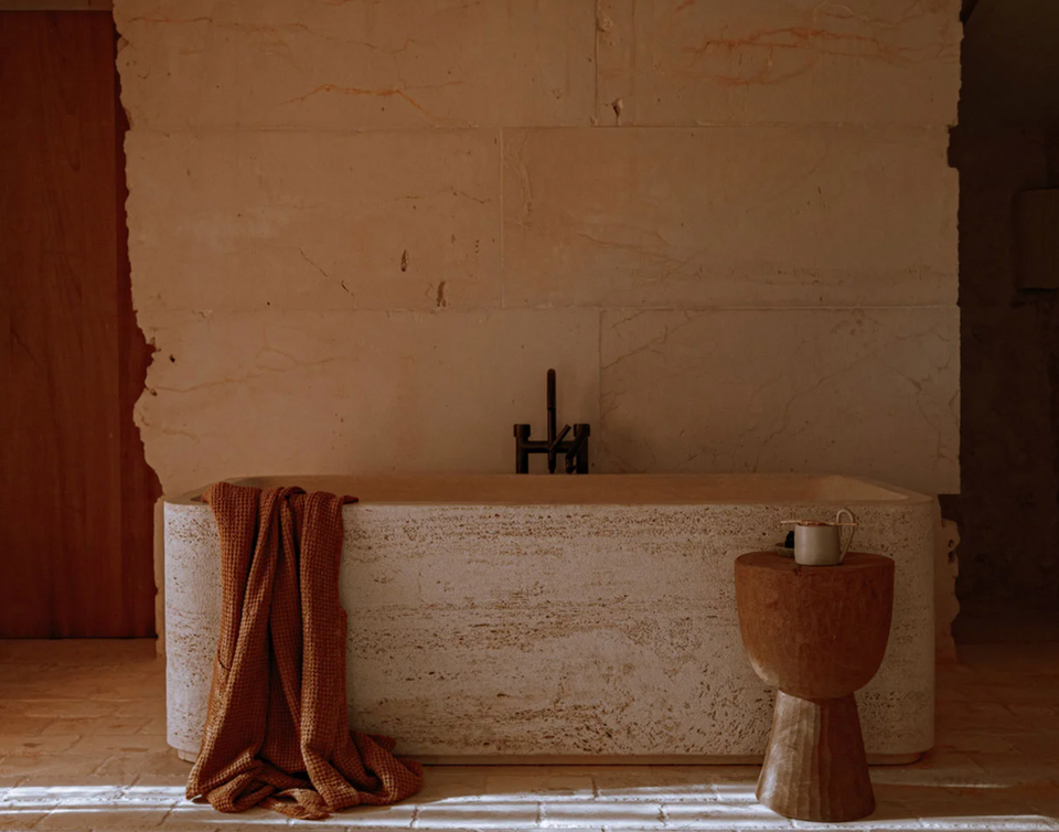 Son Blanc’s 14 rooms are a love letter to Menorca’s rugged beauty, each a unique expression of the island’s materials and craftsmanship. Housed in the restored farmhouse, rooms feature terracotta tiles, marés stone walls, and reclaimed wood, with natural textiles like linen and woven straw adding warmth. Some open to private gardens, others to terraces with outdoor hot tubs or balconies framing dramatic views of the wilderness. Artisanal touches, ceramic lamps by Nuria Efe, textural wall hangings by Cañadas Murúa, or curved tile headboards create a dreamy ambiance that feels both organic and refined. The minibar, stocked with freshly picked citrus, handmade truffles, and herb-infused iced tea in reusable bottles, reflects the finca’s attention to detail.